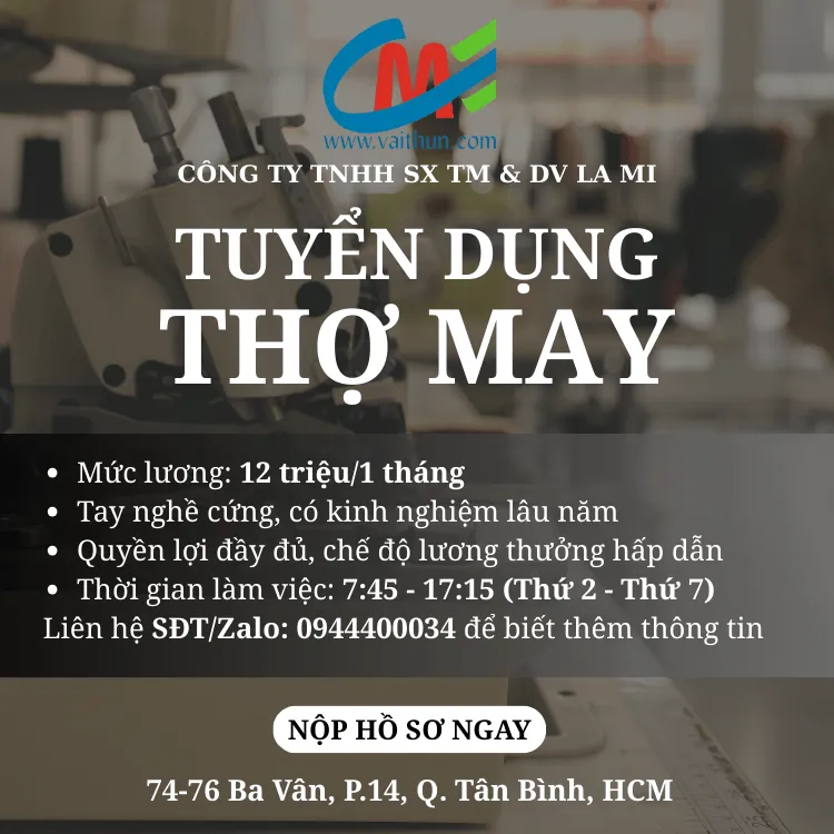 Nhằm nâng cao trải nghiệm mẫu mã cho khách hàng, Công ty Vải thun La Mi cần tuyển dụng thêm thợ may tay nghề cao để phục vụ hoạt động phát triển sản phẩm.